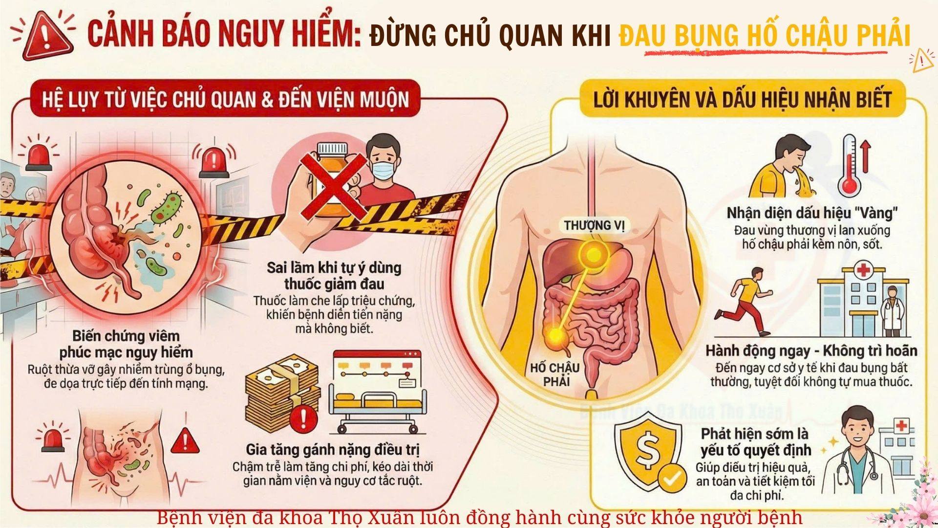 – Khi có các biểu hiện đau bụng bất thường, đặc biệt là đau vùng thượng vị tăng dần và lan xuống hố chậu phải, kèm theo nôn, sốt, cần đến ngay cơ sở y tế để được thăm khám và xử trí kịp thời.
